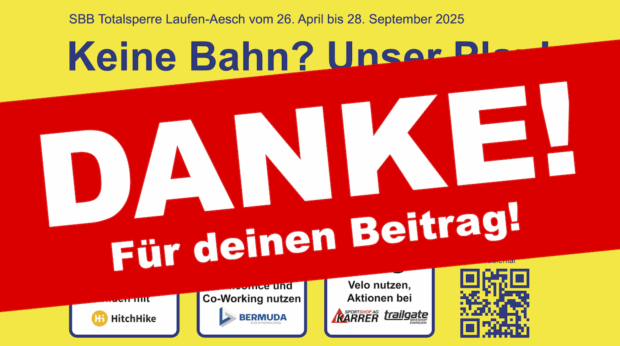 Das ging ja zackig. Kaum hat die Sperre begonnen ist sie schon wieder um. Seit heute Montag 29.09.2025 ist die SBB-Totalsperre Geschichte. Der Fahrplanwechsel zum 15 Minuten Takt in Laufen und weiteren Änderungen an den Buslinien findet am 14. Dezember 2025 statt. Wir möchten uns bei allen … [weiter lesen ...] ÜberVorbei
